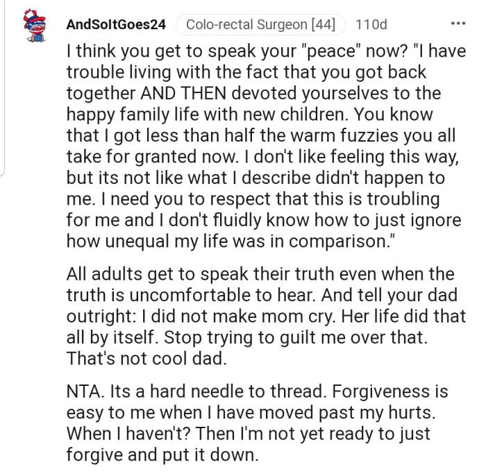 "NTA...This Is Your Opportunity to Talk to Both of Your Parents About Your Feelings and Resentment."