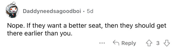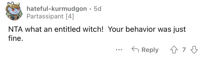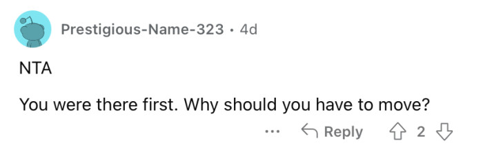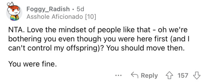 A few minutes later, the family moved to a larger table that had become free. The mother told the OP and her fiancé that they should have just moved out of their way in the first place.