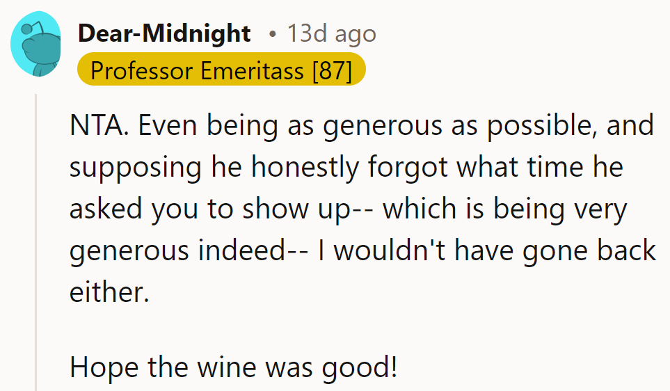 In the end, perhaps the cold outside was a mere reflection of the frosty welcome awaiting her inside. A dinner missed but a bullet dodged, reminding us all that sometimes, the best response to being left out in the cold is simply to stay in the warmth of your own home.