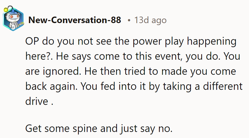 "You fed into it by taking a different drive. Get some spine and just say no."