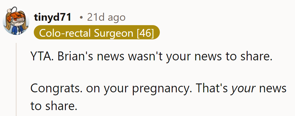 Is she in the wrong for sharing Brian's pregnancy news from social media where their coworkers follow him?