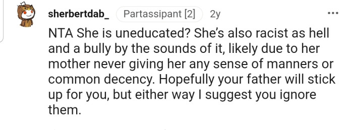 In addition, the community also accused her step-sister of harboring underlying racist tendencies. In this virtual embrace of support, OP discovered that she was not alone and that her feelings were justified.