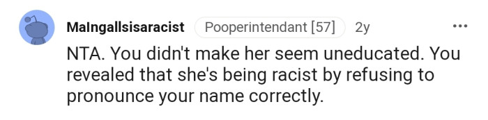 "You revealed that she's being racist by refusing to pronounce your name correctly."