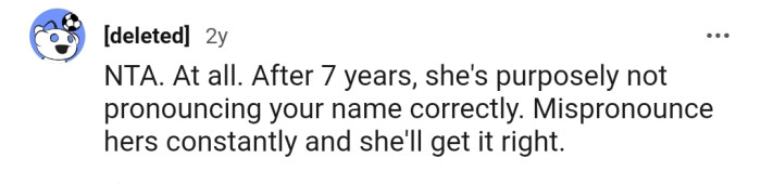 "NTA. At all. After 7 years, she's purposely not pronouncing your name correctly."