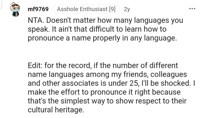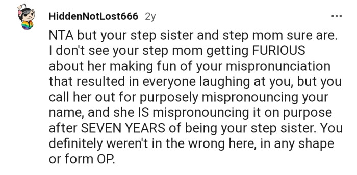 Within the Reddit community, OP found solace, validation, and a shared sense of indignation towards her step-sister's behavior. Redditors swiftly condemned her step-sister's deliberate mispronunciations and public ridicule, emphasizing the importance of respecting names and cultures.