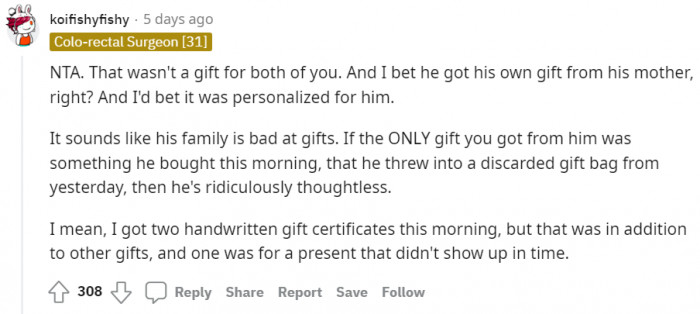 Despite the fact that this story brought to the surface some problems with the holiday season, it was still a time of great joy and happiness for their family. The Redditor explained that her husband is a really good partner 99.99% of the time who totally "missed the mark" on this one.