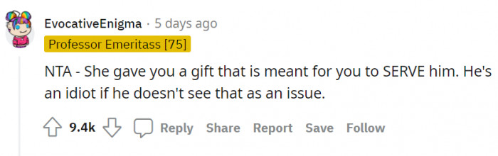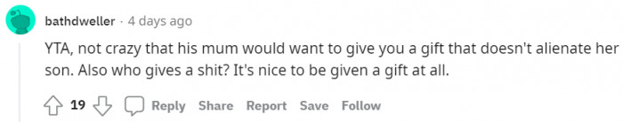 "Not crazy that his mum would want to give you a gift that doesn't alienate her son"