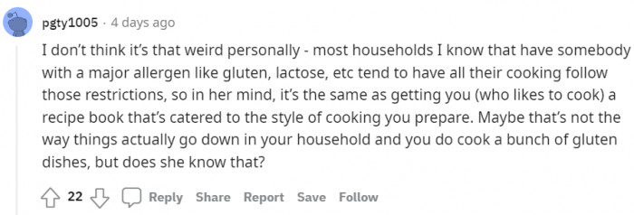 I opened it and immediately said, “Oh, I think you gave me the wrong box; this must be for you.” Inside was a recipe book for gluten-free cooking. Here’s the thing - I am not gluten-free. He is. I looked at him, confused, and he, still happy and unaware of the storm of emotions about to rain upon him, told me that he suggested this gift to his mom. I was incredulous and let him know that this was a gift for him, not for me. This is basically like giving a mom a vacuum for Christmas - here’s a gift so that you can serve me!