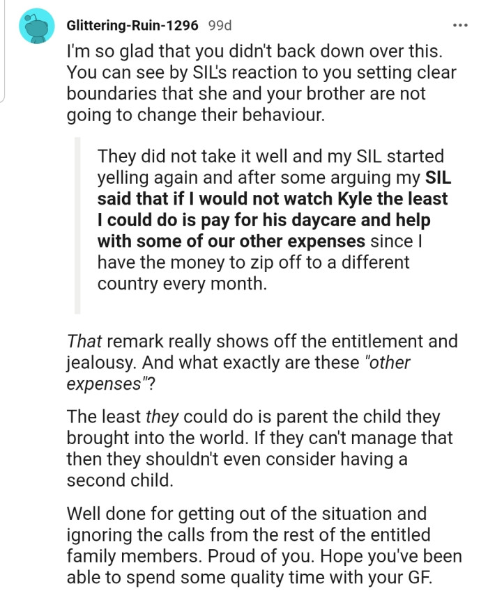 "Well done for getting out of the situation and ignoring the calls from the rest of the entitled family members."