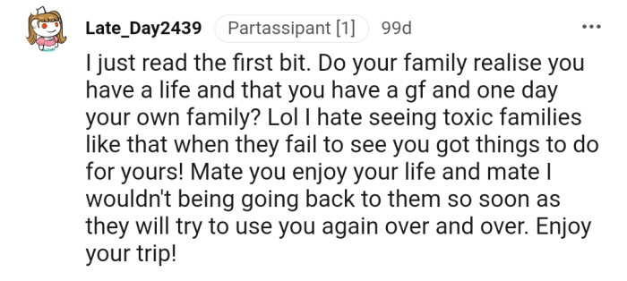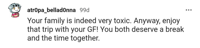 "Your family is indeed very toxic. Anyway, enjoy that trip with your girlfriend!"
