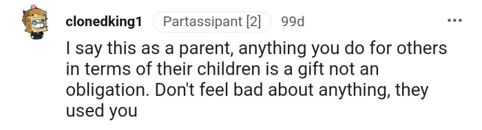 "I say this as a parent: anything you do for others in terms of their children is a gift, not an obligation."