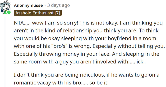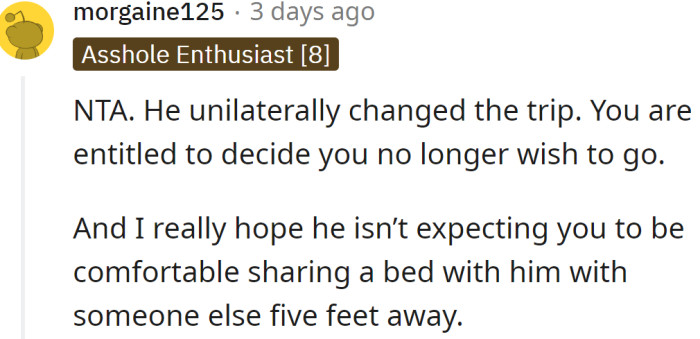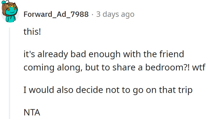 But the thought of the three of them spending nights together in the same room was too much for OP. It made her feel uncomfortable and ruined her entire concept of the "romantic getaway" as it was supposed to be in the first place.