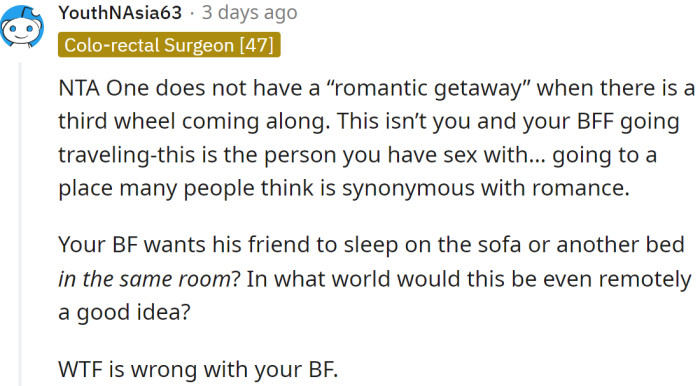 Despite her objections, the boyfriend argued that his friend had already paid for his flight ticket and assured her that his friend would not interfere with their romantic getaway. He would just sleep with them in a double room or on the sofa.