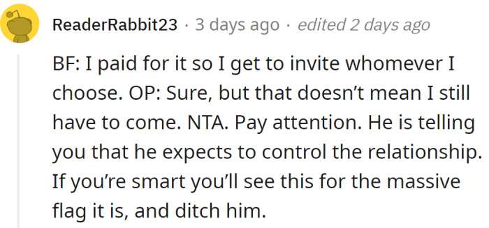He told her that since he was the one paying for most of the trip, he felt he had the right to bring his friend with him, regardless of her opinion. She then told him she would not be going on the trip if his friend came along.