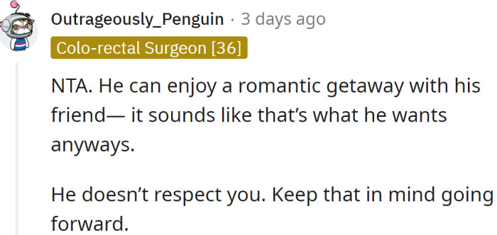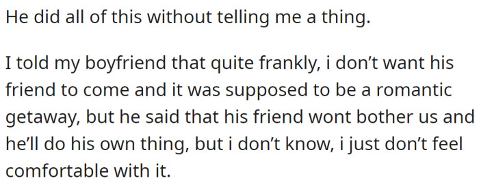 "Quite frankly, I don’t want his friend to come, and it was supposed to be a romantic getaway," explained OP: