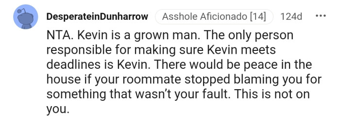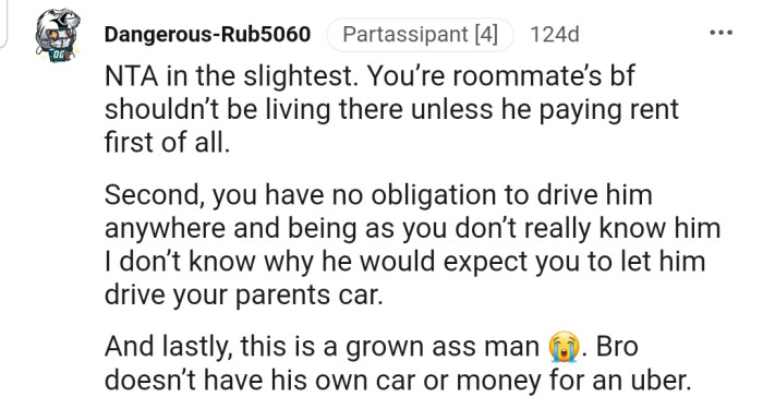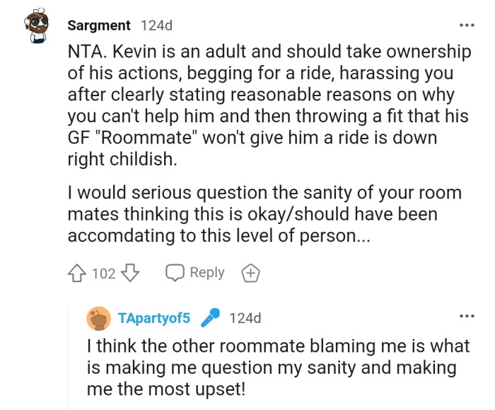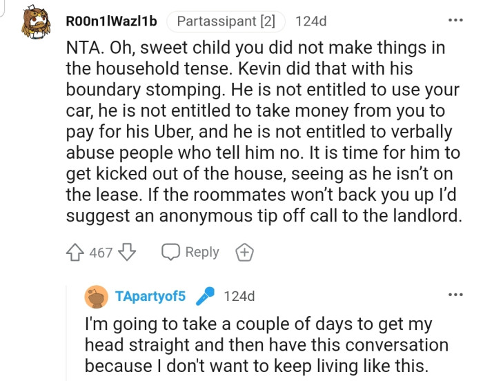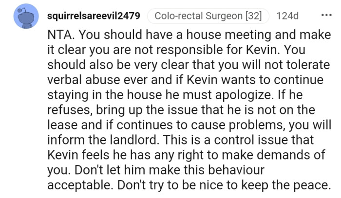 Regardless, commenters are firmly in OP's corner, declaring her to be NTA in this situation. The prevailing sentiment is that Kevin displayed a sense of entitlement and rudeness, which is further amplified by the fact that he is not even listed as a leaseholder but merely the boyfriend of one of the roommates.