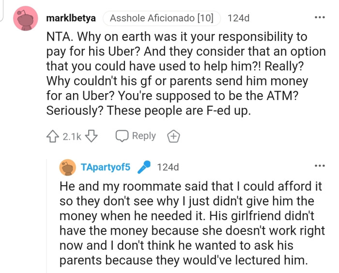 "Why couldn't his girlfriend or parents send him money for an Uber? You're supposed to be the ATM?"