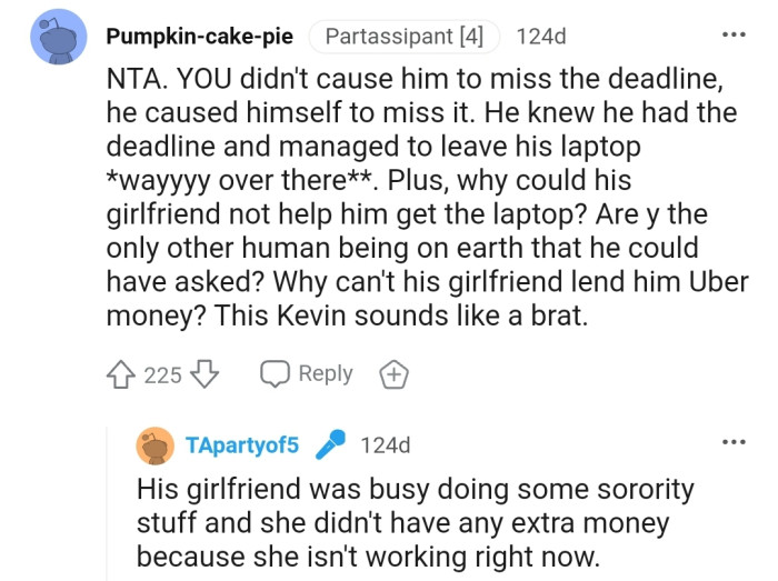 "Why can't his girlfriend lend him Uber money? This Kevin sounds like a brat."