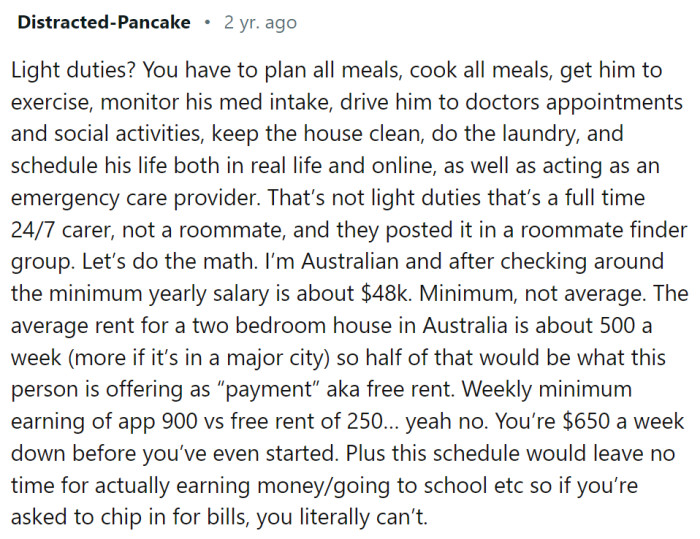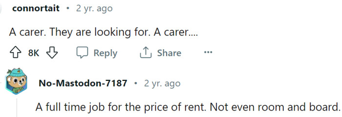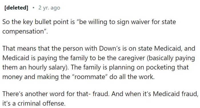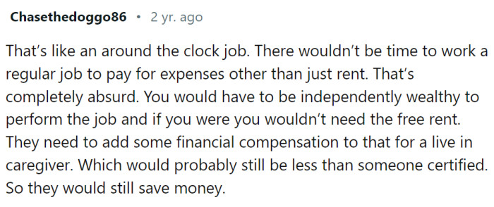 Redditors could hardly believe the audacity of this post, pointing out that the expectations listed amount to a 24-hour job, far beyond the realm of a typical roommate situation. Many commenters also raised concerns about the ethics of such an arrangement, speculating that the family might intend to pocket any disability money while getting these extensive services provided for free.