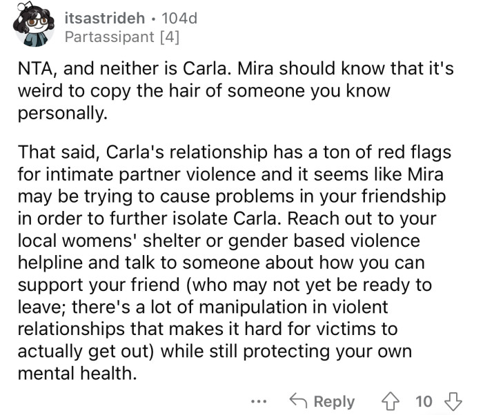When Carla asked the OP why she was changing her hair, she told her she didn't want to look like Mira. But Carla became defensive and angry with the OP.