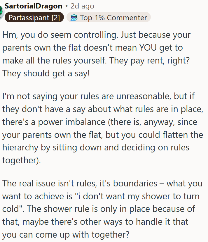 While Haley respected this, Mary ignored it a few times. Things came to a head when OP returned home cold and tired, only to lose her hot shower because Mary got in at the same time. When OP brought it up, Mary accused her of being controlling and avoided her afterward.
