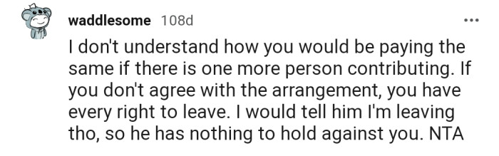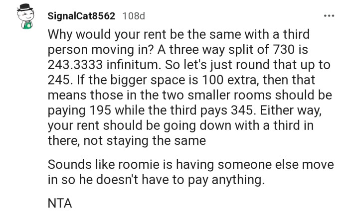 Reddit.comConsequently, OP decided to move into the bigger room for more comfort, considering that the new roommate was male. However, her best friend then informed her that she would pay an extra $100 in rent if she moved into the bigger room. So, OP has quietly decided that it's time to move out.
