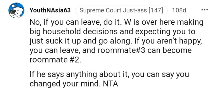 "If you can leave, do it. Your friend is over here making big household decisions and expecting you to just suck it up and go along."