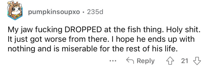 "I hope he ends up with nothing and is miserable for the rest of his life."