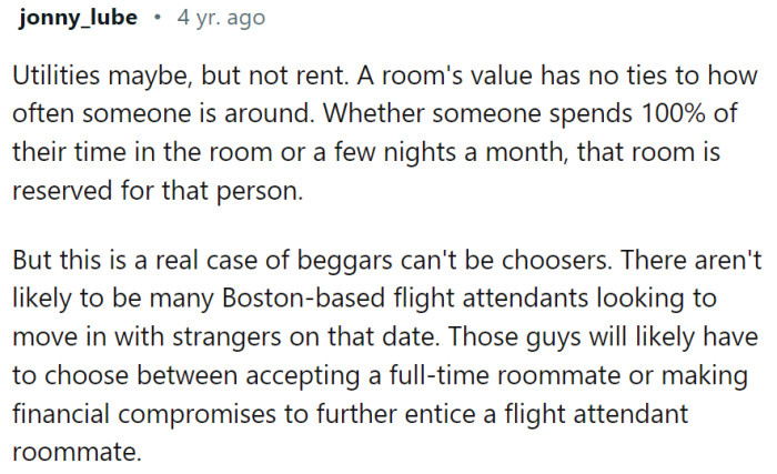 In this context, the preference for a flight attendant as a roommate can be viewed as an attempt to maintain personal autonomy while still having a social arrangement. Understanding these dynamics can help individuals navigate their housing choices more effectively.