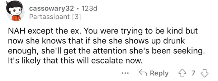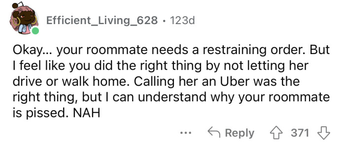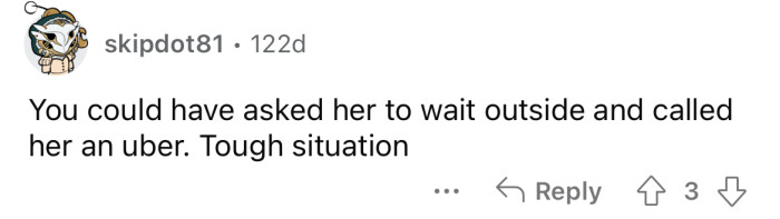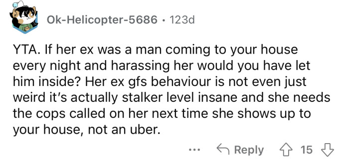 The Redditor says she didn't feel comfortable sending the ex away in the state she was in, so she allowed her to come inside while she waited for an Uber. While she was there, the OP texted her roommate to let her know what was happening in case she was on her way home.
