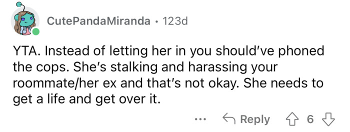 Reddit/VastCelery6379She explained that her roommate recently dumped her ex-girlfriend, and since then, the ex keeps turning up at their apartment.