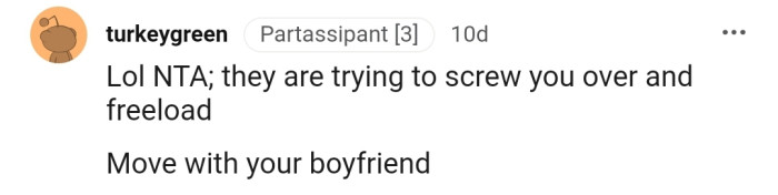 Instead of condoning such behavior, the commenters have encouraged OP to move out and leave them with the burden of paying the remaining bills alone. Thankfully, OP's boyfriend is willing to take her in for the time being.