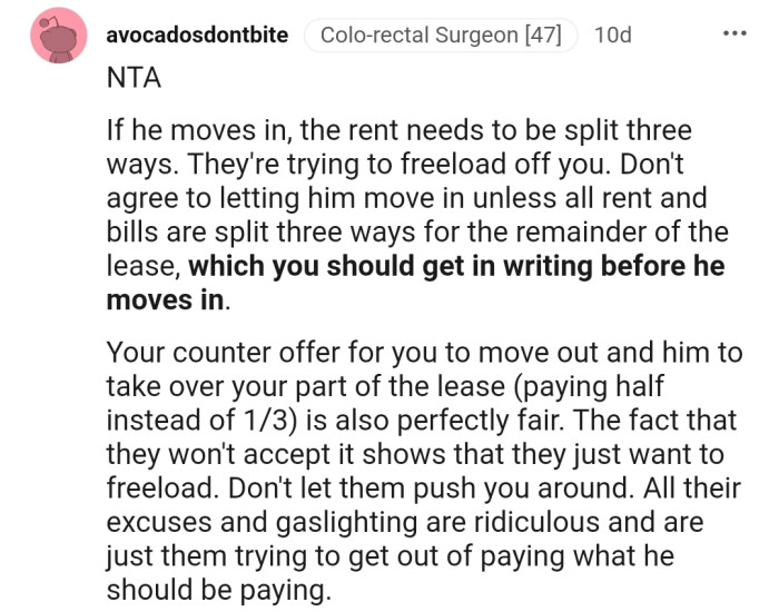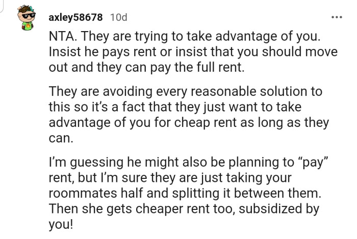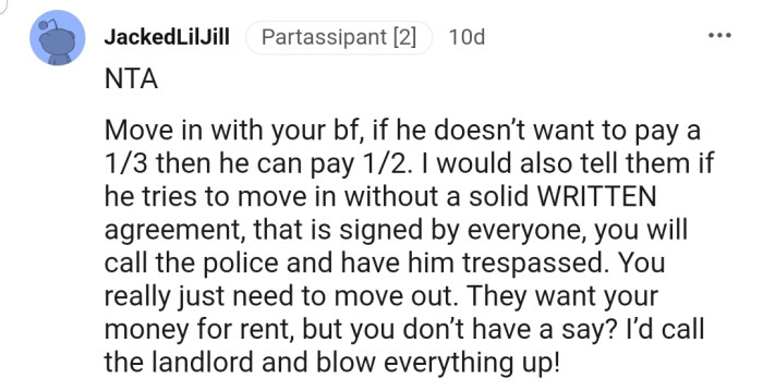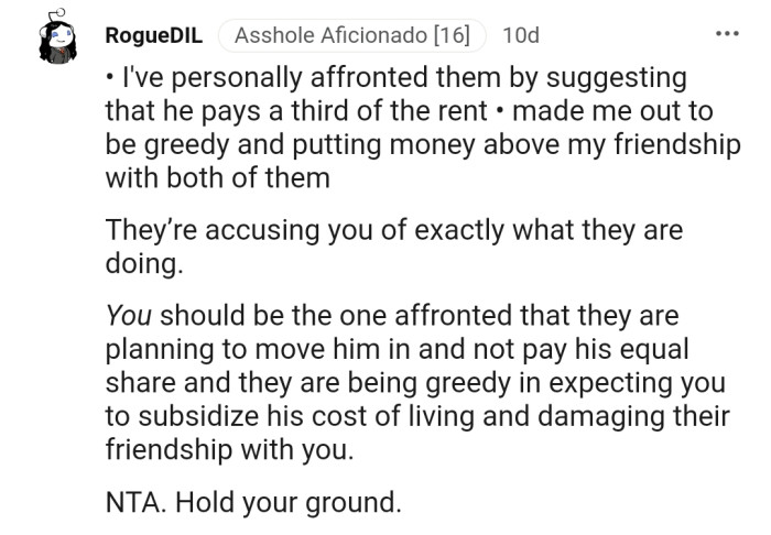 After calculating what this would mean, OP determined that the only way this move could work was if he paid one-third of the rent—and she made it crystal clear to the couple.