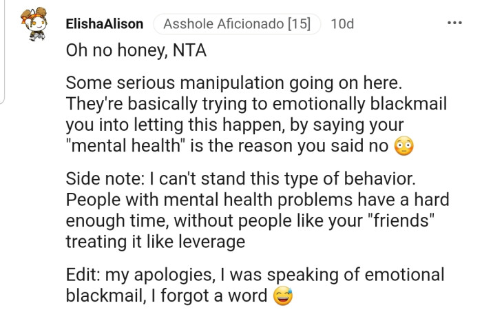 "Oh no honey, NTA. Some serious manipulation is going on here."