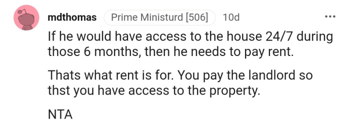 "If he would have access to the house 24/7 during those six months, then he needs to pay rent."