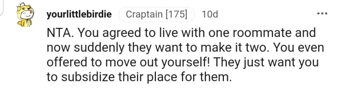 Unfortunately, OP’s condition was met with hostility from her roommate and boyfriend. Even when OP offered to remove herself from the situation by vacating the home, they vehemently disagreed.