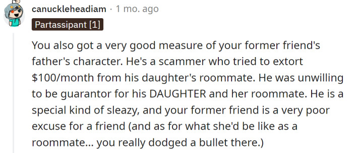 "He's a scammer who tried to extort $100/month from his daughter's roommate."