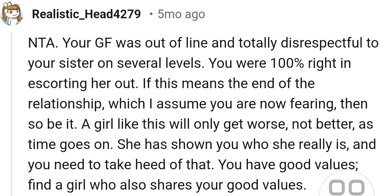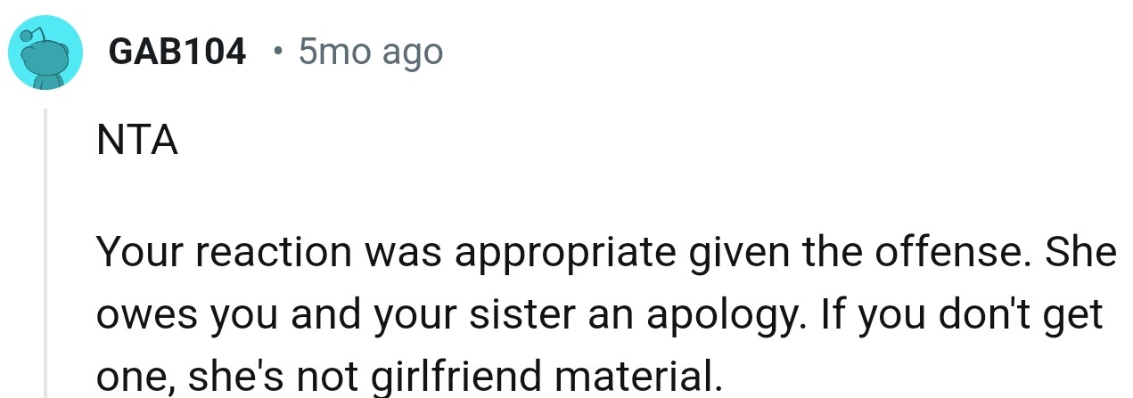 "NTA. Your GF Was Out of Line and Totally Disrespectful to Your Sister"