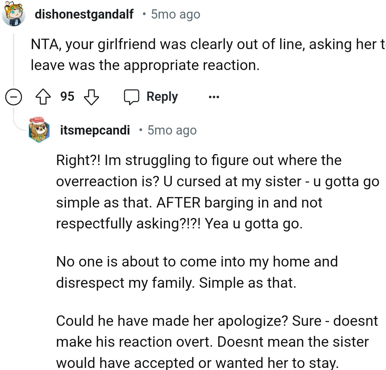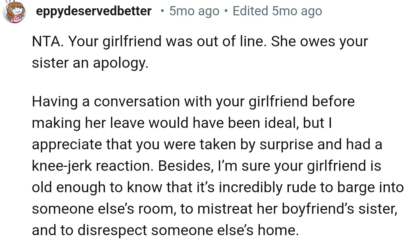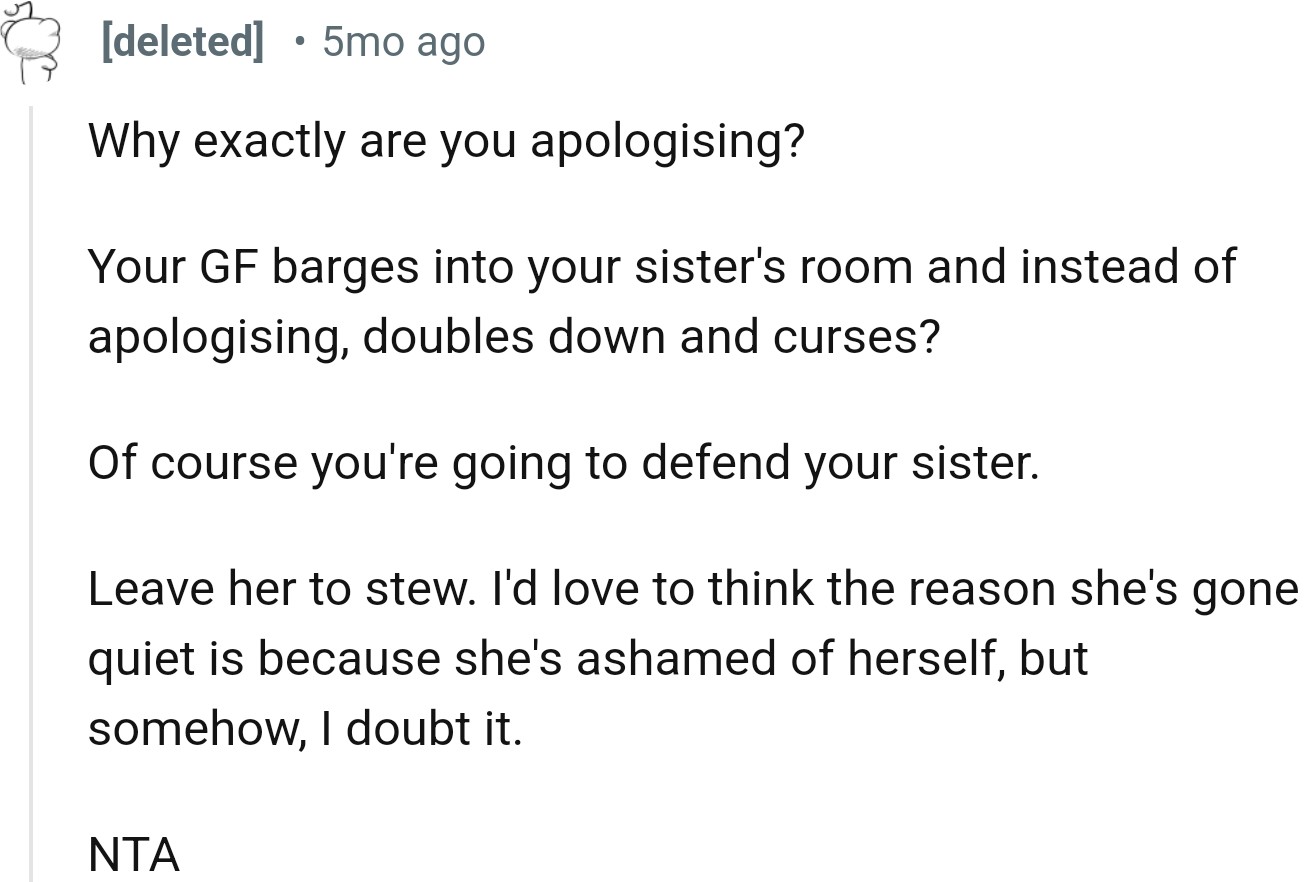 "Sure, go ahead, rummage through my closet after barging in," the sister remarked with a touch of sarcasm. Instead of apologizing, OP’s usually gentle and mild-mannered girlfriend snapped back with some pretty colorful words.