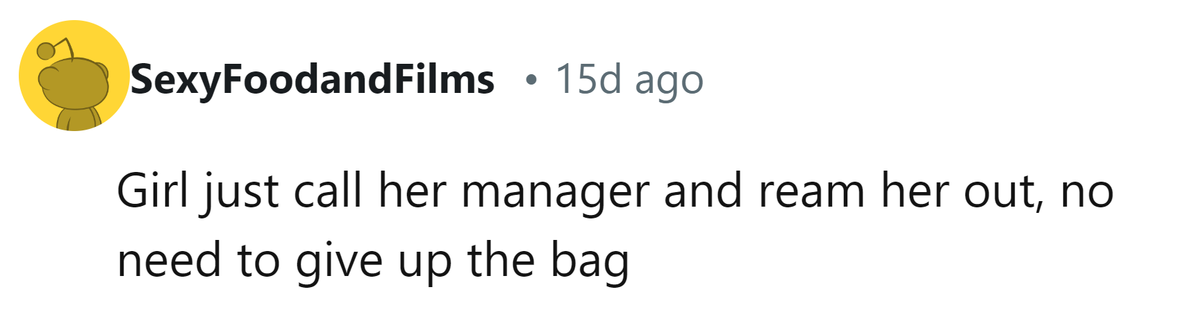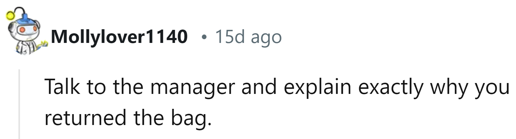 The OP told her husband she wanted to return the bag, but he said he didn't want her to miss out on something she liked because of a rude stranger. The Redditor was adamant that she didn't want the sales assistant to benefit from the sale after how rude she had been.