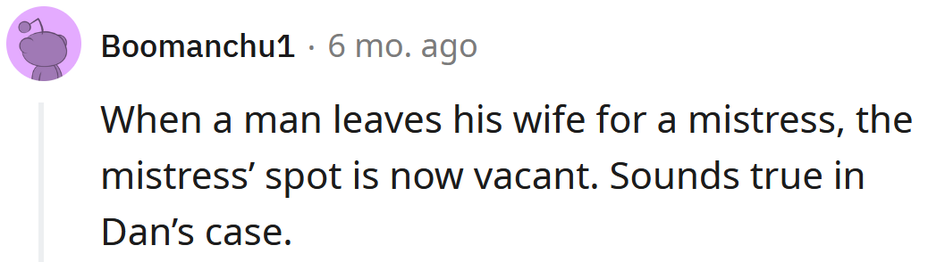 That comment clearly hurt his wife, so the OP stepped in and said, "That's rich coming from you because no amount of time spent on your appearance will ever keep Dan interested for long."