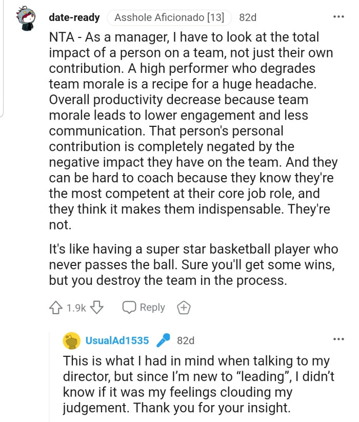 "NTA...A high performer who degrades team morale is a recipe for a huge headache."