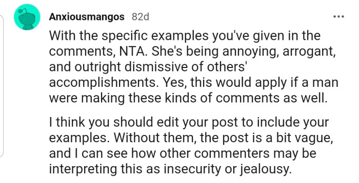 "NTA. She's being annoying, arrogant, and outright dismissive of others' accomplishments."