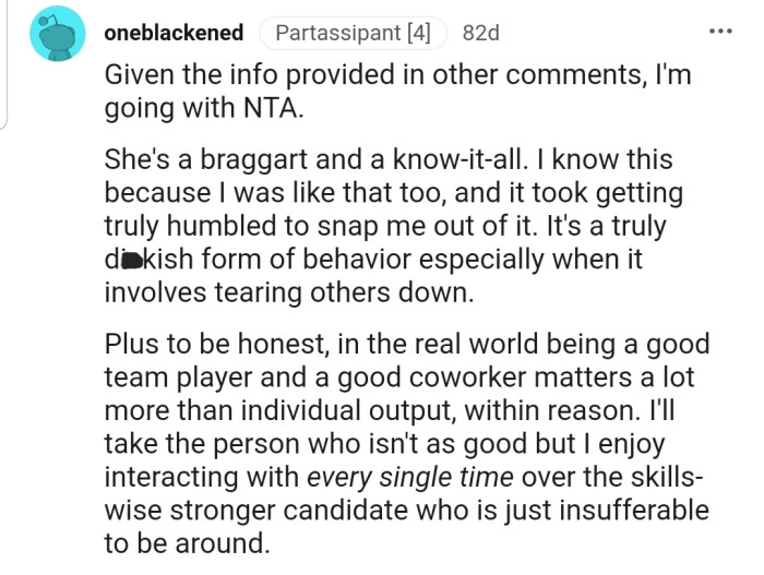 "She's a braggart and a know-it-all. I know this because I was like that too."