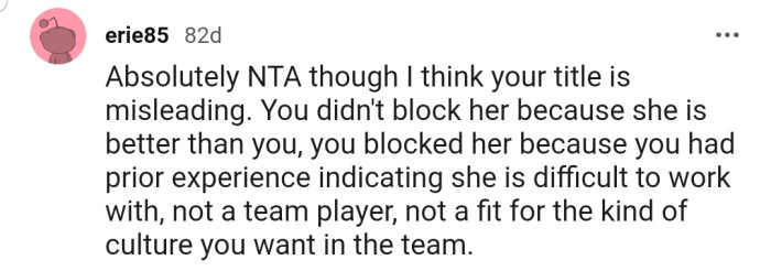 "NTA. You blocked her because she is not a fit for the kind of culture you want in the team."