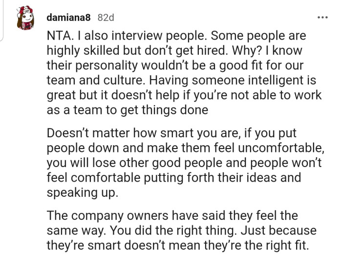 From what we can deduce, getting a job isn't just about your personal qualifications. The way you will potentially impact other members of the team is also important.