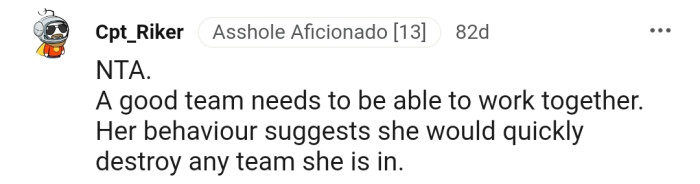 The Reddit community is solidly behind OP, and they believe she only did what was best for the team.