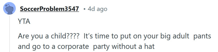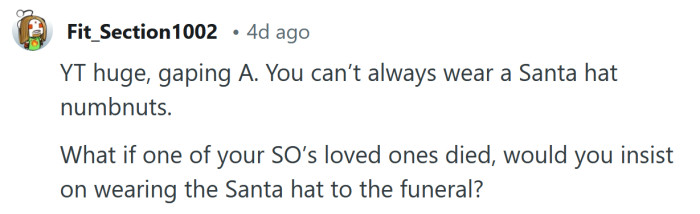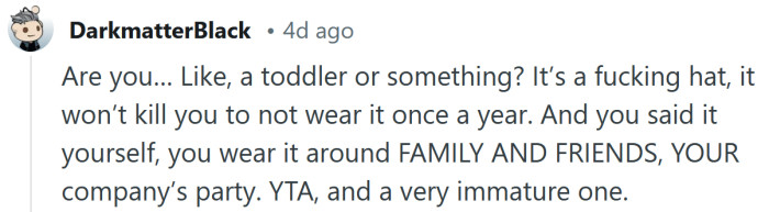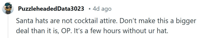 Fast forward to the next year, and the same debate over the Santa hat resurfaced. This time, the OP decided he would put his foot down, claiming he wouldn’t attend the party unless he could wear his cherished holiday tradition.