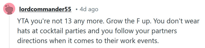 The drama started when his partner invited him to her company holiday party, which had a strict “Cocktail Attire” dress code. The OP assumed the hat would fit just fine with his three-piece suit, as it had at past office parties, but his partner quickly shut it down, insisting it didn’t match the dress code.