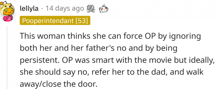 "This woman thinks she can force OP by ignoring both her and her father's no and by being persistent."